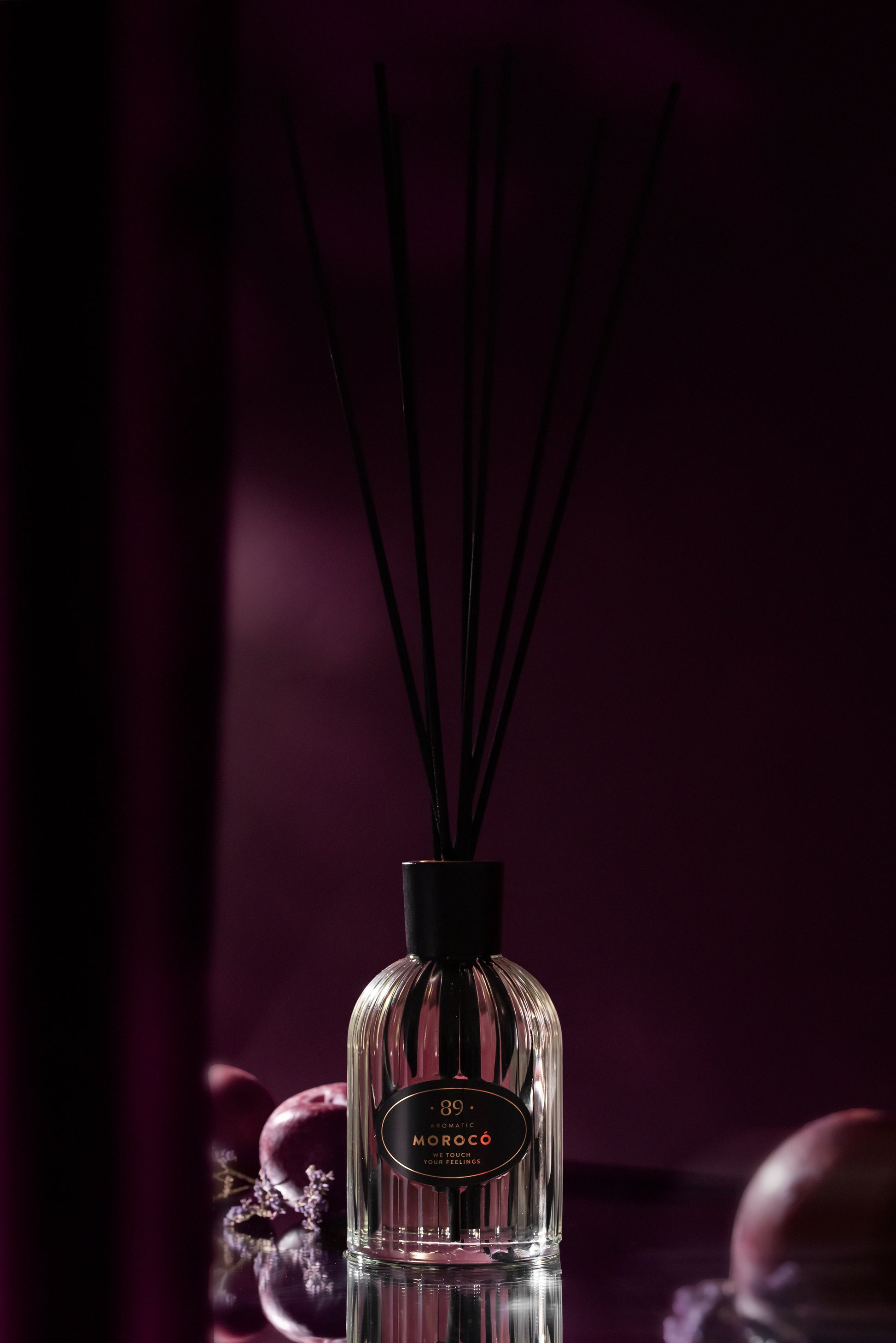 A rich and warm home fragrance, exuding exotic oriental aromas. The abundance of sweet plum blends with warming cinnamon, cloves, and smoky incense. The scent evokes the narrow streets of Marrakech, where the air is filled with a blend of spices and fruits, and the sweet fruity accord may remind some of the warmth of mulled wine. Deep tobacco, cedar, and tonka beans add depth and coziness, filling the space with mysterious luxury.